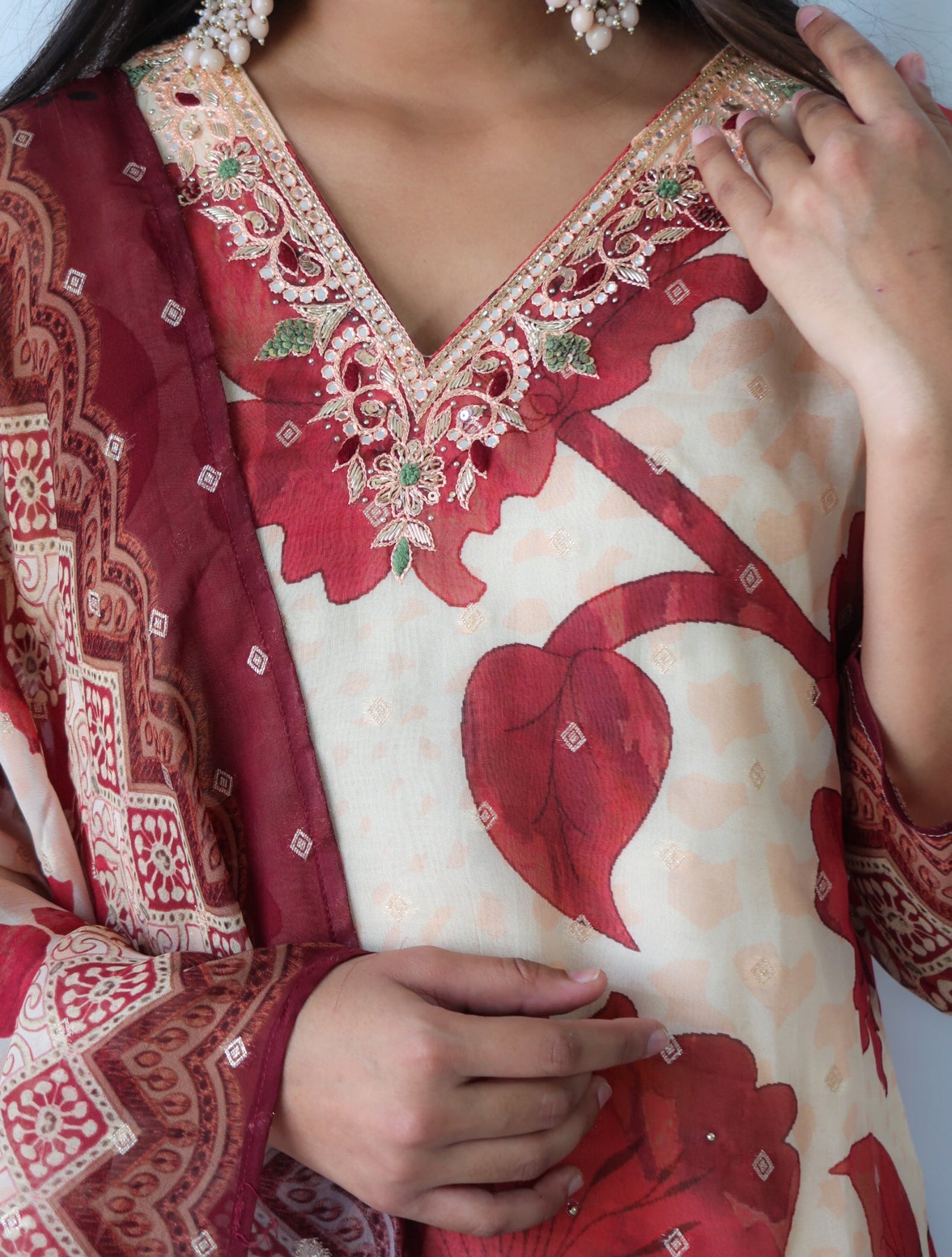 Paired with matching off-white plain pants for a clean and sophisticated silhouette, the set is completed with a contrasting cream and maroon dupatta, creating a harmonious balance of colors. Ideal for festive and special occasions, this suit set blends delicate design with timeless beauty.