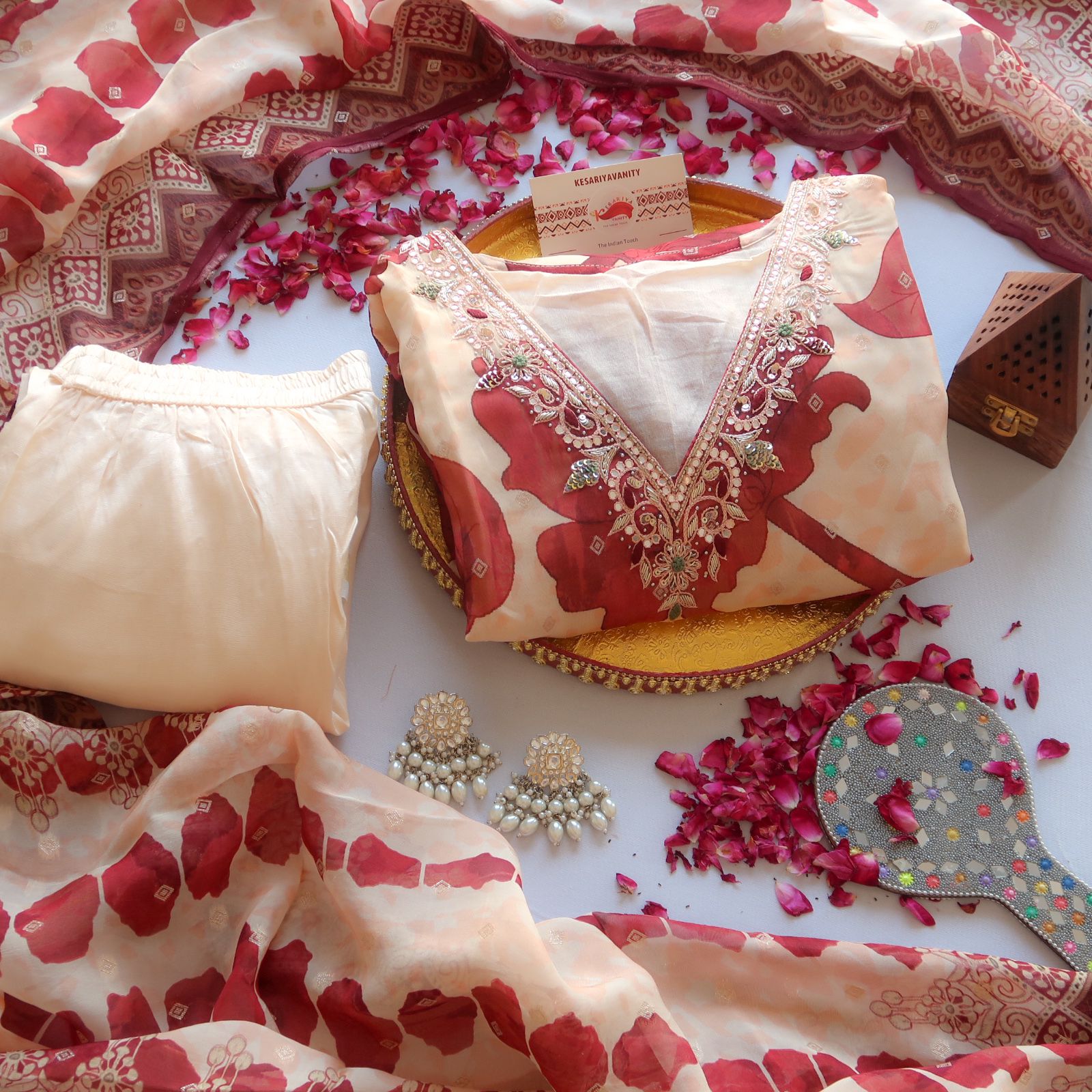 Introducing our Premium Three-Piece "Maroon Petals Suit Set," a perfect fusion of elegance and traditional craftsmanship. The off-white kurta is adorned with beautiful maroon floral prints, thoughtfully spaced to create a refined and graceful look. The V-neckline is enhanced with intricate sequin, moti, and pittan work, adding a touch of luxury and sparkle.