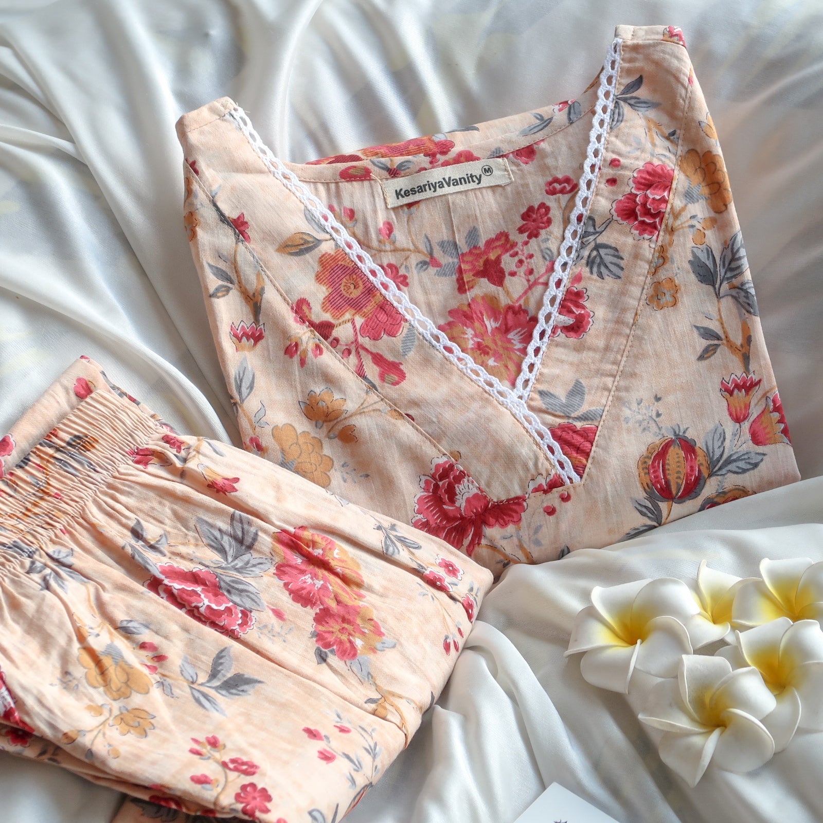 The kurta, tailored in a classic straight style. Each bloom is intricately printed, creating a mesmerizing tapestry of color and texture reminiscent of a majestic garden in full bloom.