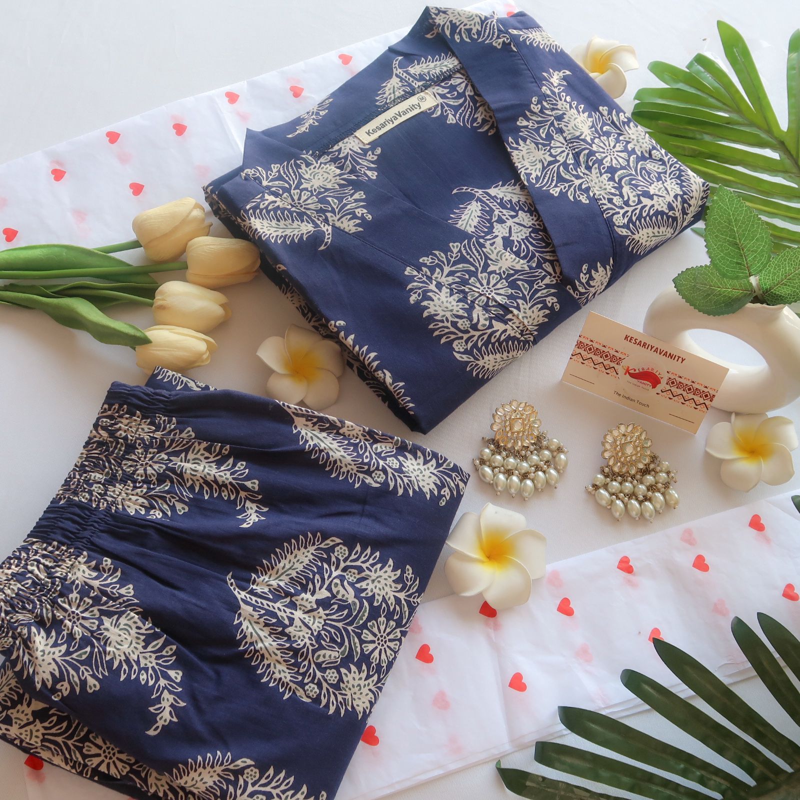 Paired with straight-fit pants in the same dark blue base and matching motifs, this set creates a cohesive and refined look. Made from soft, breathable cotton, it ensures style and comfort throughout the day.