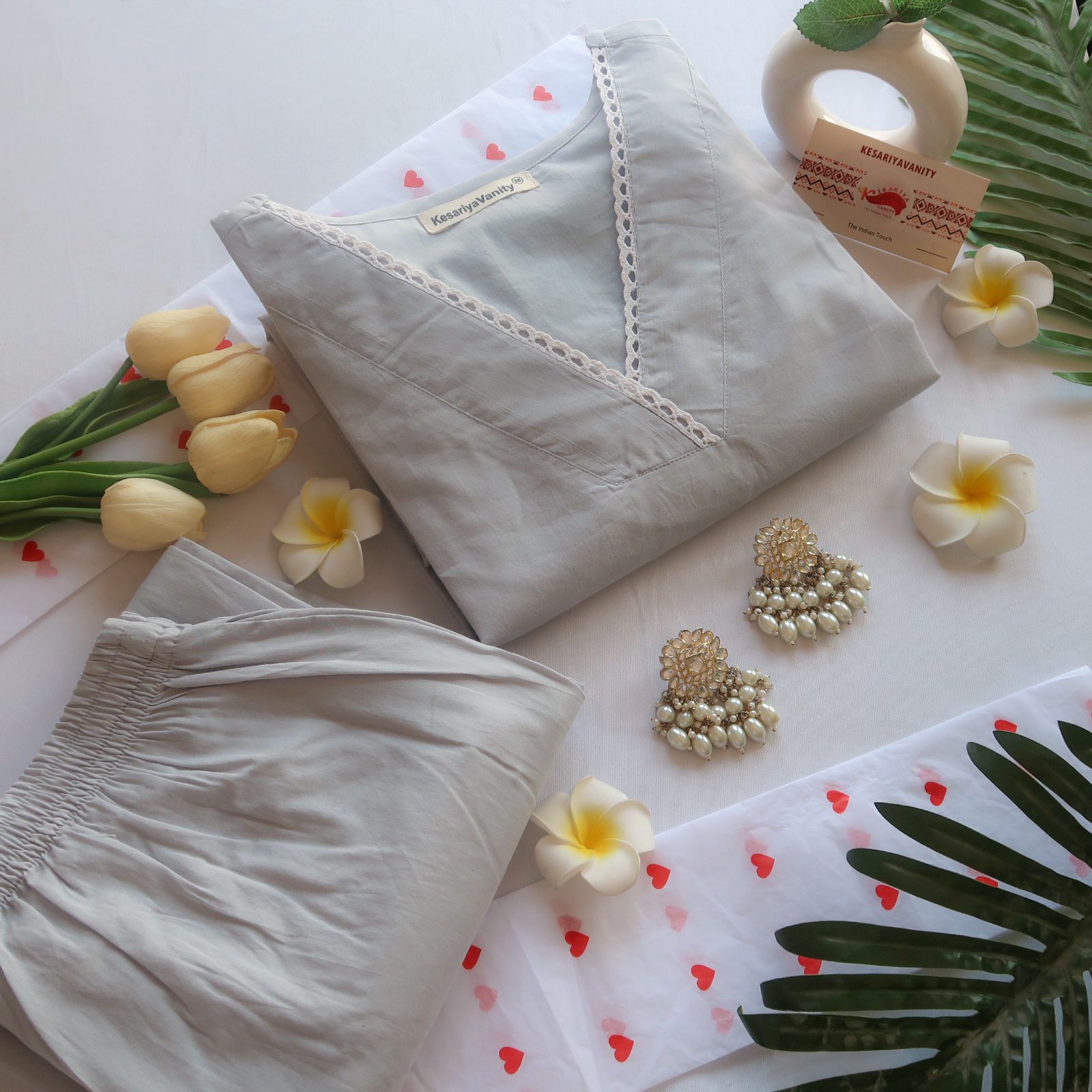 Redefine elegance with this pure cotton straight kurta pants set, perfect for understated sophistication. The kurta, in a soothing pastel light grey shade, is designed to exude effortless charm. Its V-neckline, adorned with intricate white lace detailing, adds a touch of delicate femininity, while the 3/4th sleeves offer a balance of style and comfort.Β Β