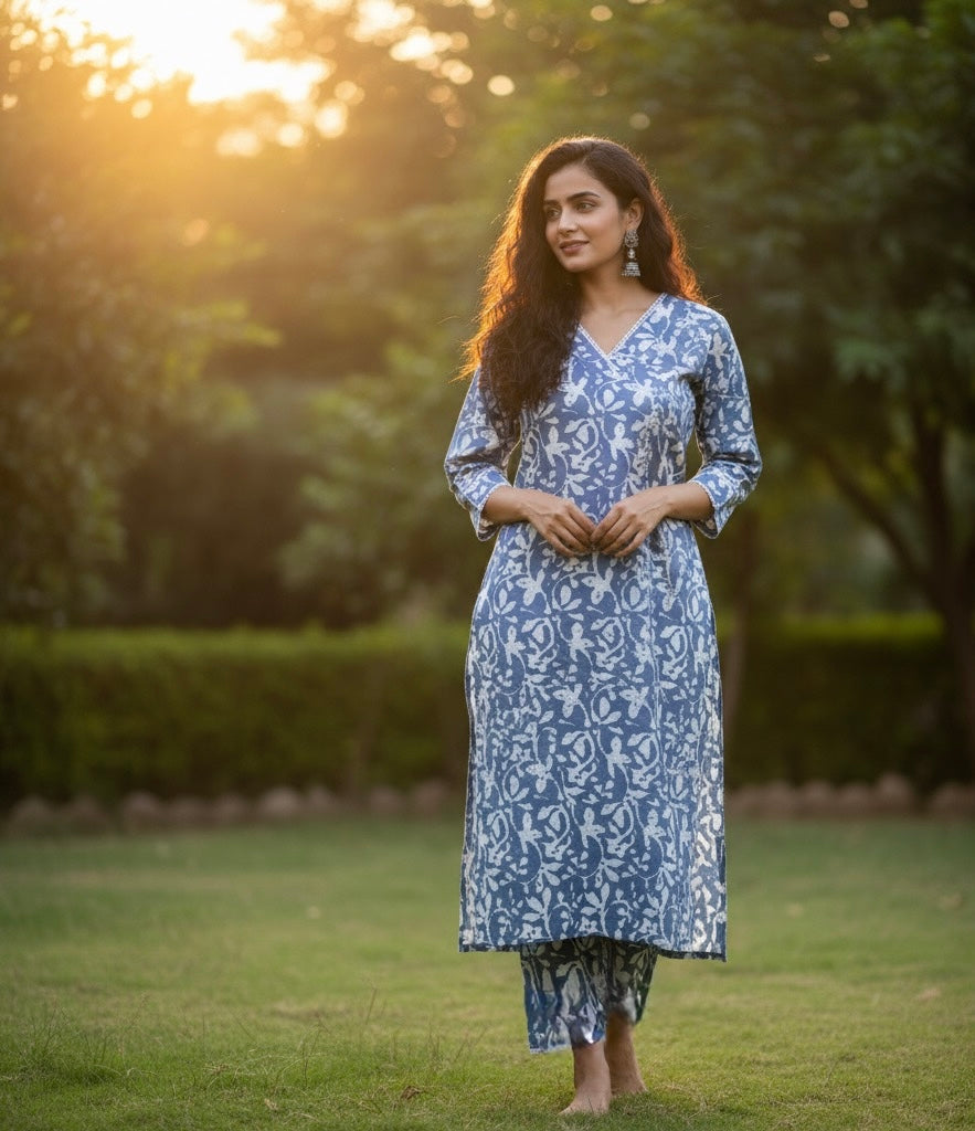 The kurta, tailored in a classic straight style. Each bloom is intricately printed, creating a mesmerizing tapestry of color and texture reminiscent of a majestic garden in full bloom.