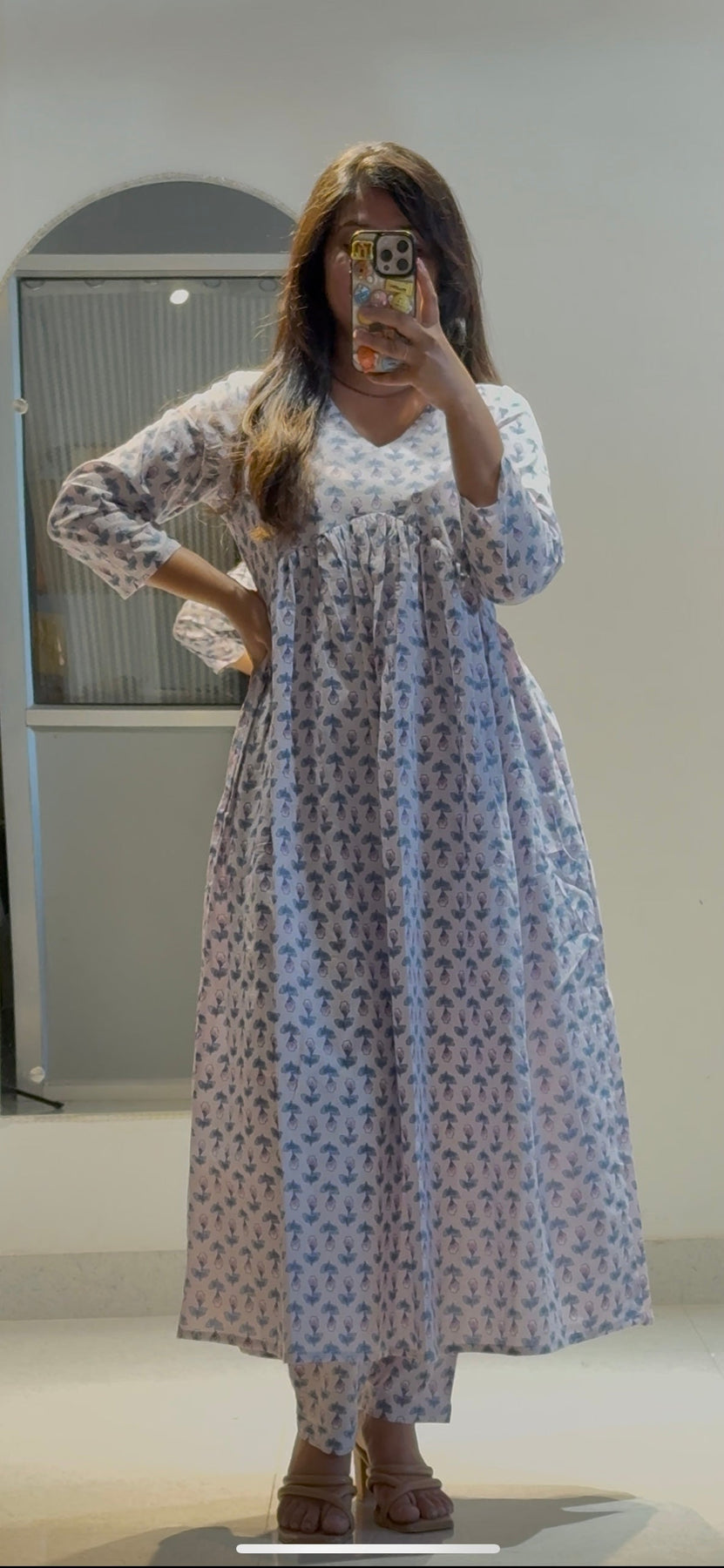 This pure cotton kurta pants set showcases a vibrant Designed in an elegant Alia cut frock style, the kurta features a flattering silhouette with no side slits and comfortable 3/4th sleeves, making it a versatile choice for both casual outings and special occasions.